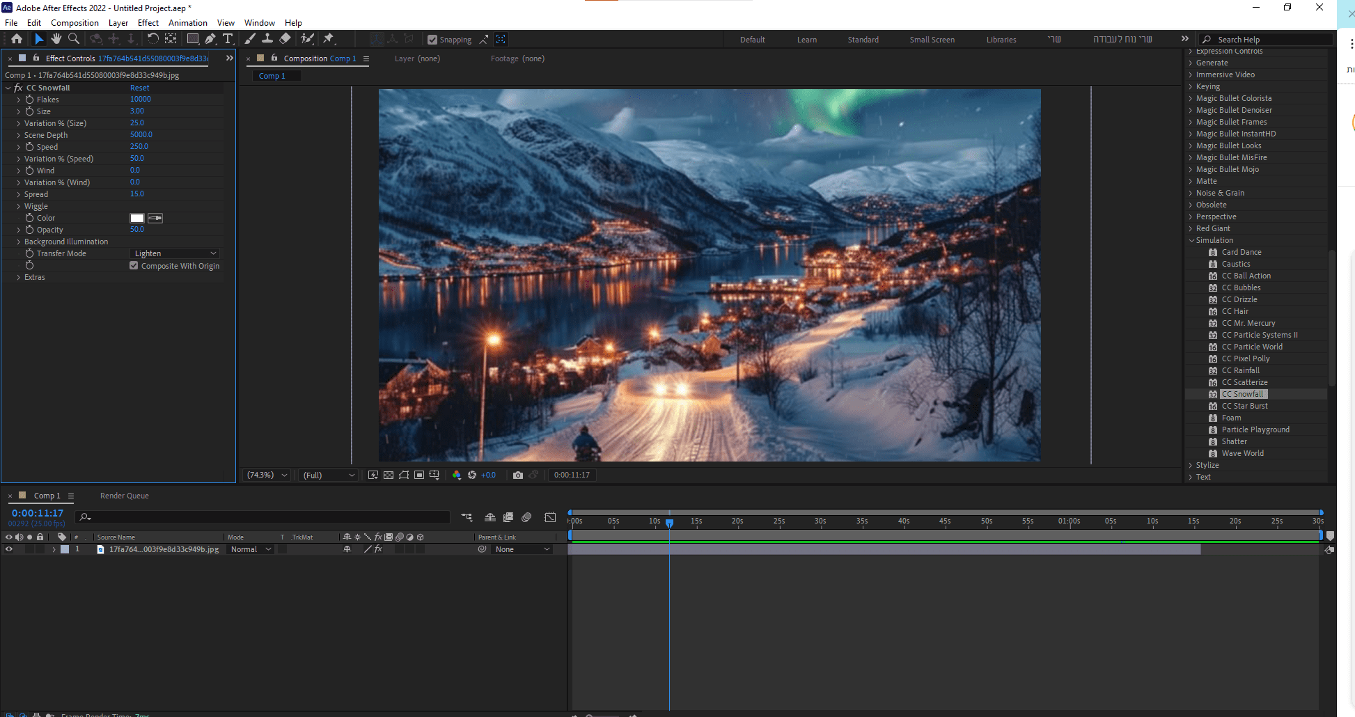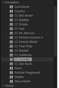 גשי לתפריט: Effect → Simulation → CC Snowfall.