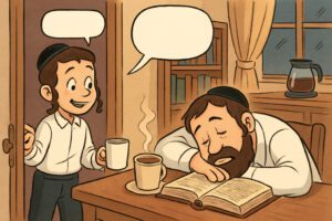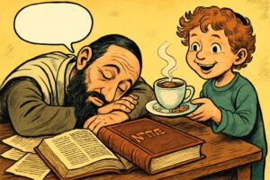 איור לקומיקס של אבא ישן ליד הגמרא והילד מגיש לו כוס קפה.